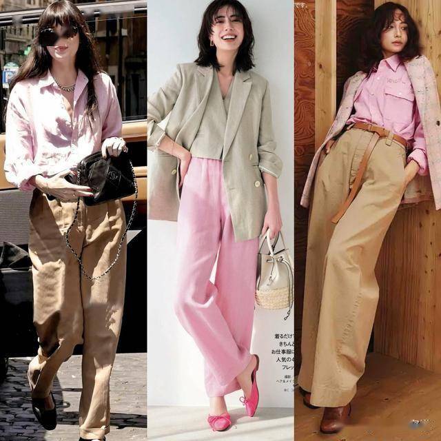 浅卡其色的西装,自带沉稳内敛的职场精英风格,配一条温柔的粉色阔腿裤,增加了时尚感,去班味很OK。