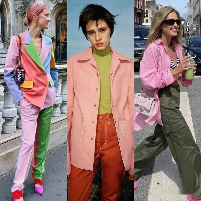 如果是肤色白皙的女生,又想穿得特别炸街,非常适合玫粉色或亮粉色,搭配翠绿或牛油果绿色,很大胆的撞色搭配,充满张力与活力,自信又时髦。