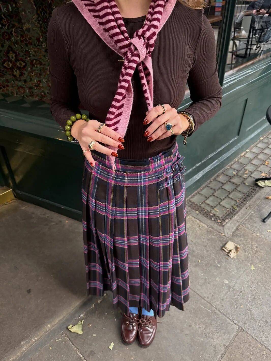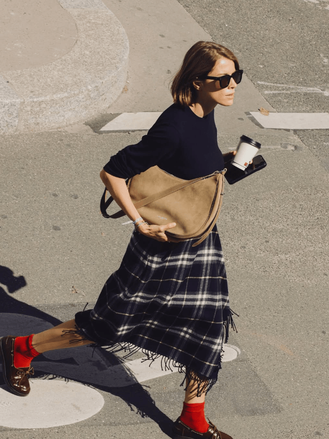 鞋子的棕色能与格纹中的暖色线条巧妙呼应,让搭配浑然一体。
