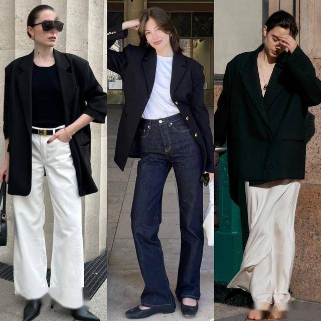 白色廓形西装,它宽松的版型展现出优雅随性的气质,又带着强大的气场感,配一条黑色的阔腿裤,增加了硬朗帅气感,简洁干净的配色轻松get出高级质感,春日上班这样穿,气质爆棚。