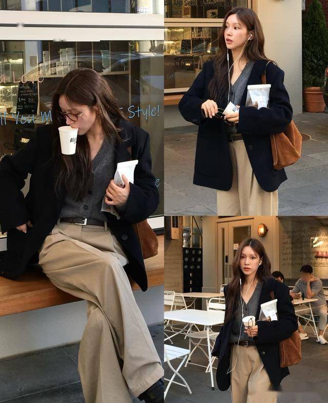 黑色西装搭配灰色毛衣,经典的无色系,简约高级,配一条卡其色的阔腿裤,立马增加了时尚感,打破沉闷更减龄。
