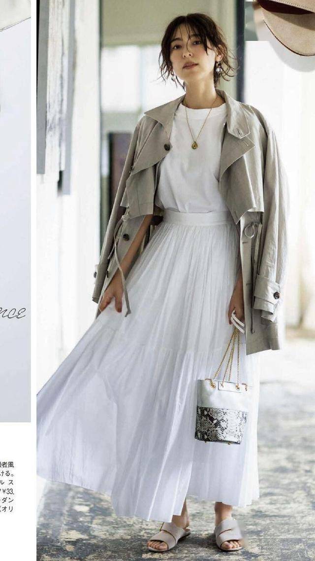 扎起头发,裹上风衣,白T恤和小白裙也增添了一丝高级感,没想到基础款之间,也能如此合拍。