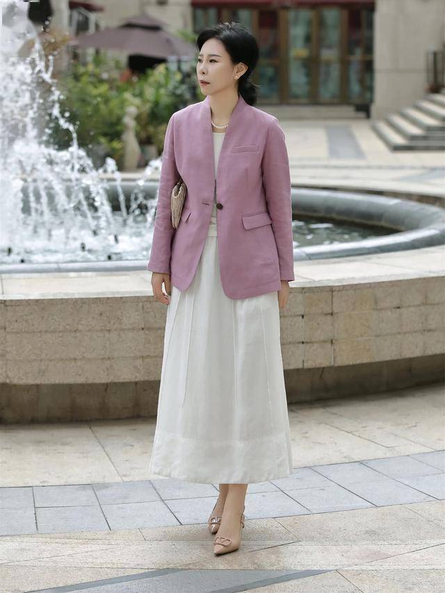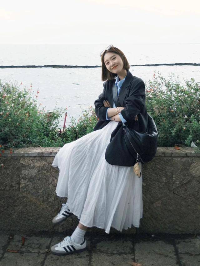 西装的飒爽,小白裙的柔美,恰好可以形成刚柔并济的效果,即便是“黑白配”,也照样吸引人。