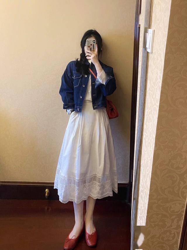 短款的牛仔外套,利落有型,镂空设计的白色半身裙,平添一丝温柔气质。