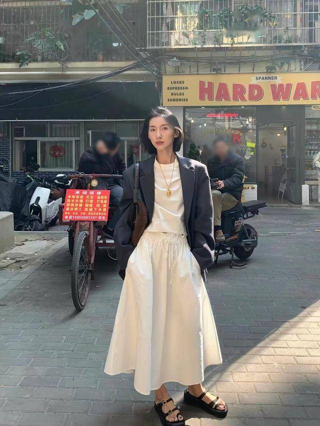极简风久看不腻,线条流畅的白色伞裙,长度及踝,安全感爆棚,过上一件oversize西装,飒爽帅气!