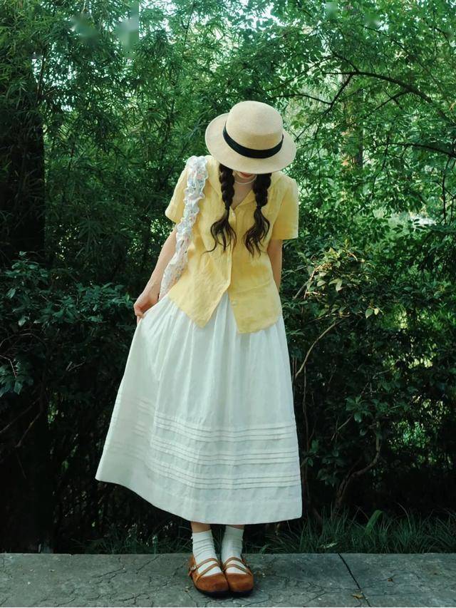 简单的白色半身裙,配件黄色短袖衬衫,清新又文艺。