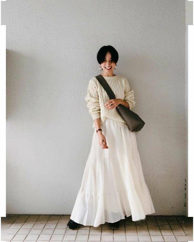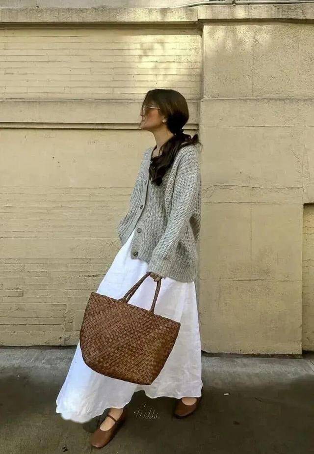宽松版型的灰色毛衣外套,搭配亚麻及踝长裙,春风起,瞬间就勾勒出最美的画面。