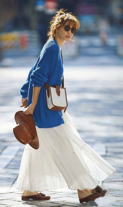 宝蓝色的毛衣外套,长度遮臀,搭配白色薄纱裙,仙气飘飘。