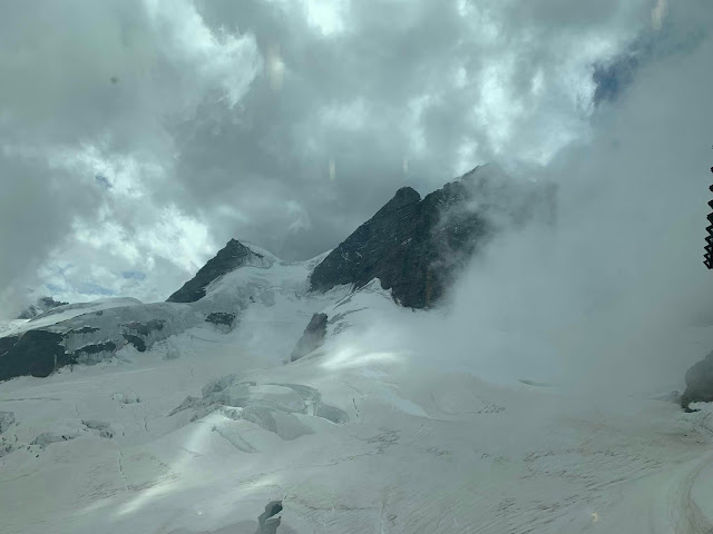 终于到了欧洲之巅Top of Europe,海拔3454米,LD不幸出现高原反应,头晕恶心,四肢无力,送到山上急救站,医生查了一下,说问题不大,休息了十分钟之后,看看还是不行,就建议我们坐下一班火车下山,回到海拔2061米的Kleine Scheidegg。一般海拔3000米以上因为缺氧会诱发高山反应,而且我们一路徒步,可能水分补充不够,身体也有些脱水,所以这是个教训。无奈之下,只好留下小朋友,让他们自己在峰顶玩了,我陪LD先坐车下山了。这时的少女峰上又是风起云涌,陷在一片大雾之中了。