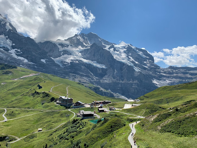 登顶回望,小路上攀登的人络绎不绝,远处的少女峰犹抱琵琶半遮面。