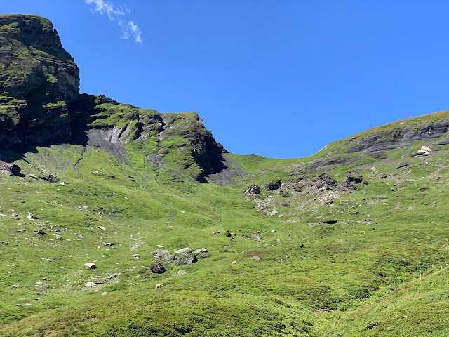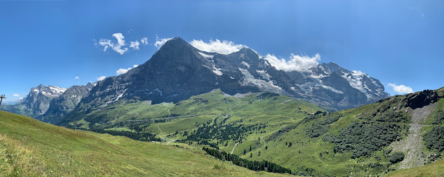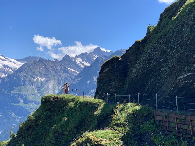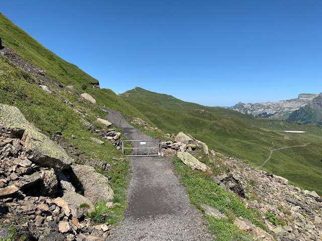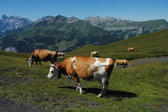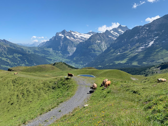 从山顶下来,回到缆车站,已经是正午,该出发走Panoramaweg Trail了,两点之前要赶到Kleine Scheidegg,上少女峰。一路走去,景色秀丽,精彩纷呈,真的是不虚此行。最先看到的是牛群,脖子上都挂着铃铛,在天地山水之间,自由自在,这个才是真正的散养有机牛吧。我们行走的山道上还有铁制的栏杆,只有人能开启通过,大概是为了防止牛群走失所设。