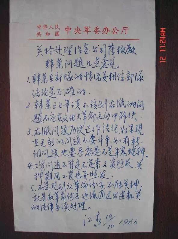 传说的 江青 代笔 毛泽东 给 傅作义回电的手稿