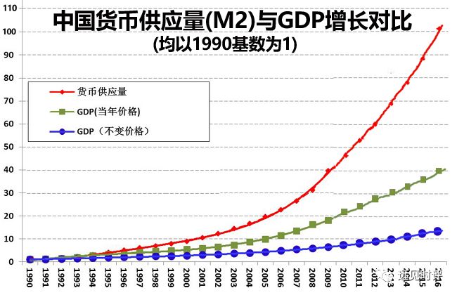 接下来简单说说通货膨胀。通货膨胀实质是政府多发货币来打劫全民的财富,正如马克思所言“通货膨胀是政府对全民财富的掠夺”。台湾度过五十年代的极端困难情况后,经济进入高速发展,但货币发行量始终与GDP增长同步,因而台湾的物价非常稳定。大陆官方公布的通货膨胀率一直不高,但与民众生活密切相关的房价和农副产品价格,最近十几年好多涨了十多倍。看看下面两张图,你就知道原因何在了(若是看不懂,那就先回去补习一下小学的数学知识):