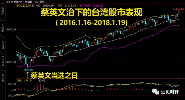 尤其难得的是,自蔡英文2016年1月16日当选之后,台股即由7627.89点起步,然后稳步上升,至本周收盘时创1991年来的历史新高,离1990年的历史最高点仅一步之遥,两年时间上涨了46.2%。上面即为台股加权指数的周K线图。