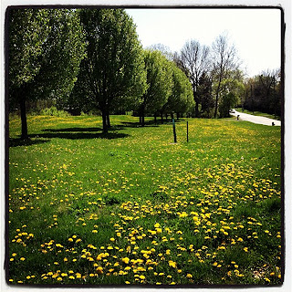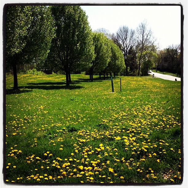 下面这张照片,是我每天要经过的一条小路。这种景色,一看就觉得春天好:空气清新,阳光灿烂,色彩明快。草地上撒满的蒲公英,更让画面增色不少。