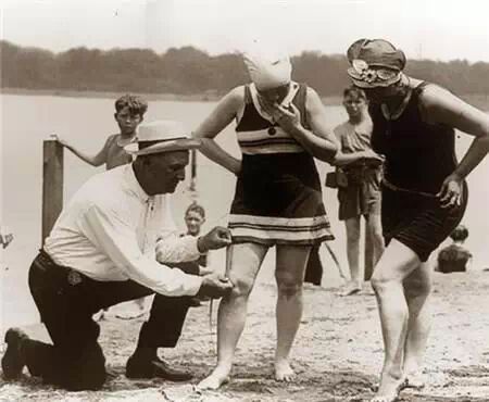 10、1920年,海滩管理员在量女泳客的游泳衣,确保泳衣不能太短。