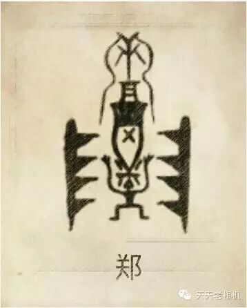郑姓图腾, 郑姓是炎帝祝融支以封建地为命名的族称,本为“酉”姓。郑由“酉”和“太阳运行的阶梯”组成。“酉”是仰韶时代的尖底瓶插在地上作为“酉时”(傍晚的时候)的观测仪器,很可能就是后代滴漏的原始形态。“酉”放在宫殿议事厅中柱下火塘(灶)前。“酉”后来演化为“尊”,所以“尊”又成为氏族族长的标志,在陶器时代相当于鼎,代表政权和权力。酉人居地为郑.
