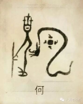 何氏图腾, 图腾左为一持戈之人,其头部以所崇拜的荷 为饰;图右为一盘湾游动之龙(即黄河),湾中为围泽而行的脚迹符号。何、荷古同音同义。显示出东夷族后裔何人在黄河下游荷泽定居生息的意象。