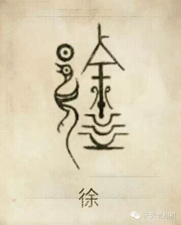 徐姓图腾,徐是淮夷一支的族称,由“余”和“太阳鸟”组成。(左边是玄鸟向日,暗合徐氏始祖由鸟所生的传说。)“余”本是“俞”,类似箭矢的尖锋,它装在天竿华表建木的顶端,指向中天,用它来代表“天齐”(天的肚脐),也就是“中央”。这个形状在7400—7000年前的湖南黔阳高庙遗址的陶器刻符和浙江余姚河姆渡遗址的陶器和骨雕上的刻符上,都已出现为天竿俞,