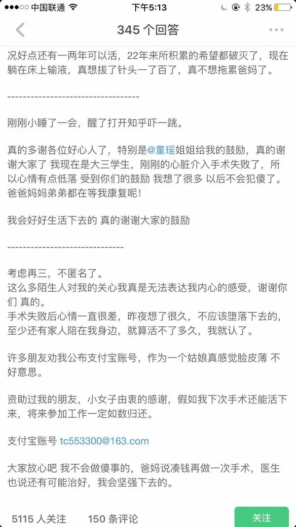 在童谣姐姐的鼓励下,(没错当时已然是知乎大V的童谣同学,为其背书),她重拾了生活的勇气。。并且贴出了自己支付宝账号。。tc553300@163.com