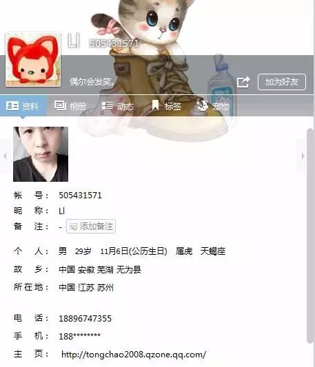 但是qq资料中,这哥们的电话号码暴露了。。。