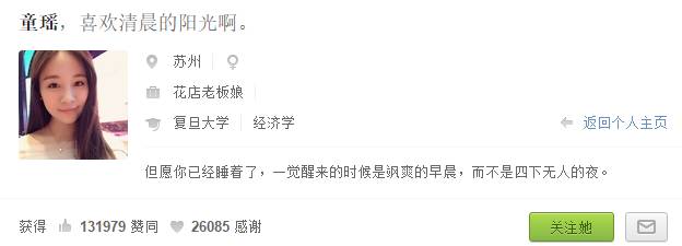 如你所见,这个名字叫“童谣”的知乎大V还是吊吊的,获得了131979个赞同,26085个感谢,还有59625个关注者。