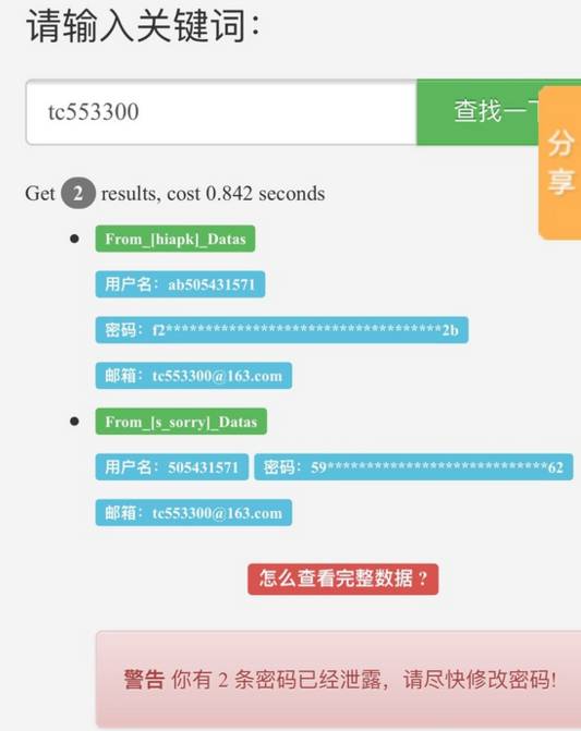 然后这哥们跑到社工库,搜了下这个支付宝的邮箱:tc553300@163.com