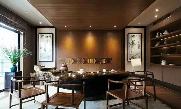 在中式茶室里,仿明清式的红木桌椅是必不可少的,再布置上素雅书法条幅、意境悠远的山水国画、情景怡人的绿色盆栽,还有古色古香的紫砂陶瓷,就可以营造一种温婉和谐的盎然情趣,用以装点清新淡雅的心境。