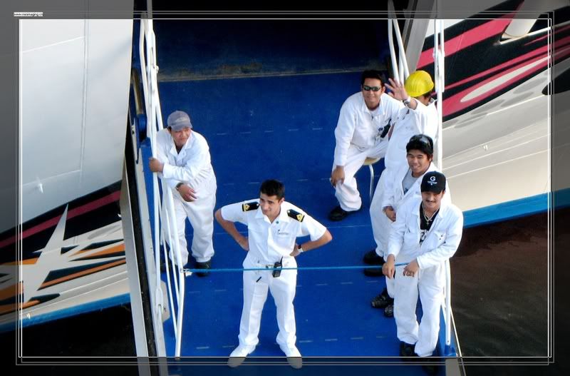 刚注意到自己当年的穿著: ZOE (左二)和我满身满脚的油污,这船员工作服,两丫头是连上岸逛码头都不想脱下来的!当年是不是很帅气?。。。