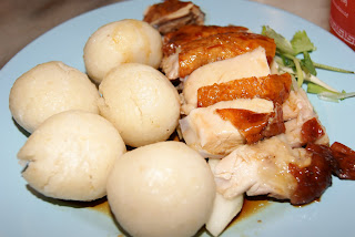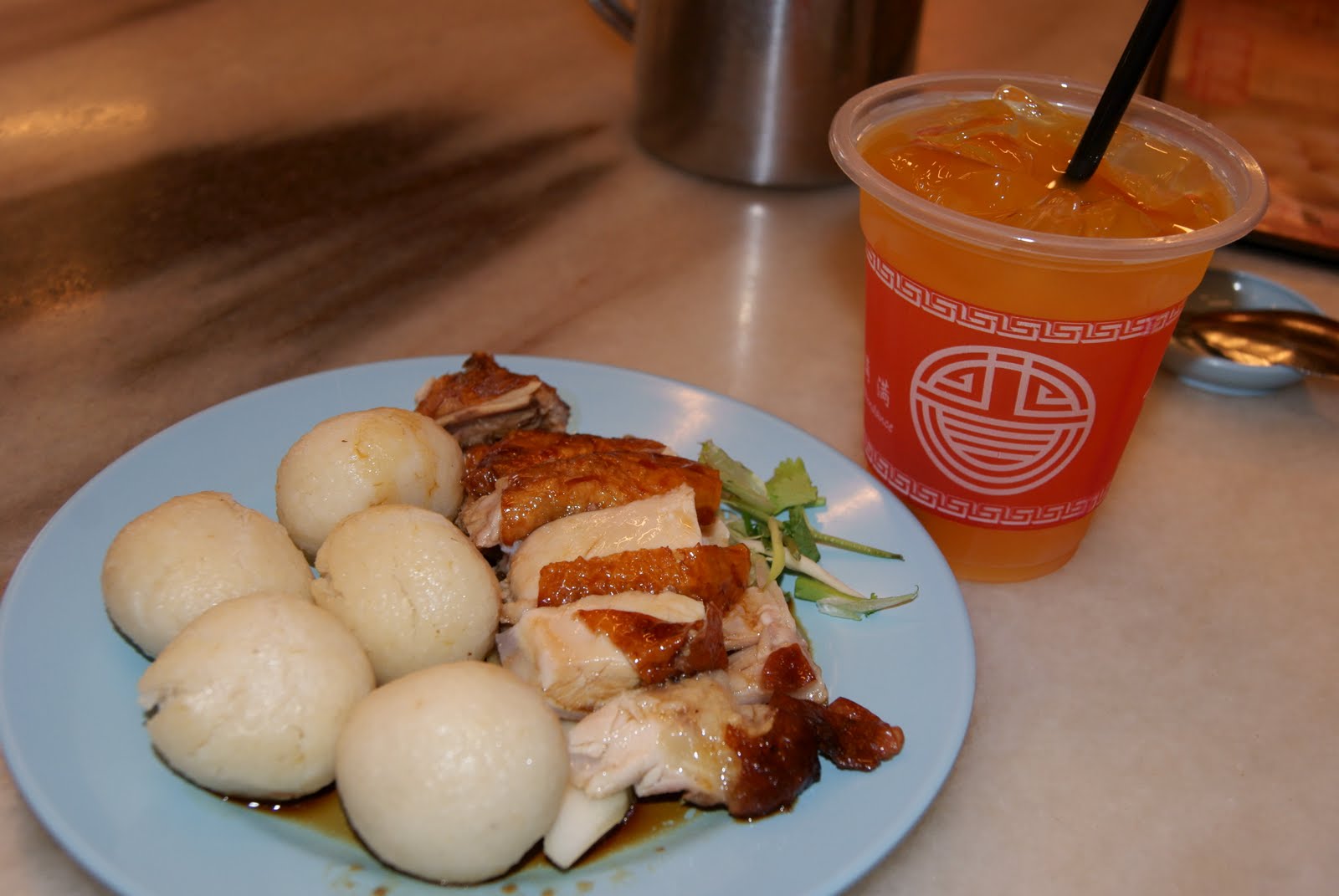 “古城”有高高的屋顶,大吊扇开着,桌凳都很干净明亮。要一杯果汁,然后就是他们的卖点鸡饭团。你只要告诉她们几位就行了,端出来的就是鸡饭团和鸡。和和记不同的是,古城还卖烧鸡肉,那你要告诉她们你是要白斩鸡还是烧鸡。