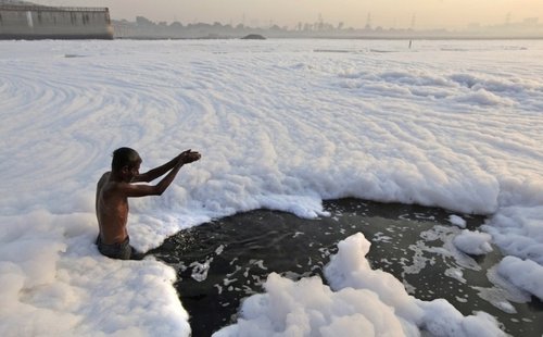 乍一看,下面这些画面中似乎展现的是冰冻河流被厚厚的积雪覆盖的景象。然而事实上,画面中显示的是印度亚穆纳河遭受严重污染的状况,像雪一样的白色物质是工业污染带来的白色泡沫。更令人惊愕的是,当地的印度教信徒仍会在这条河里进行洗礼。