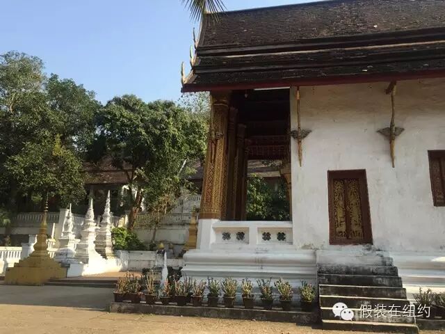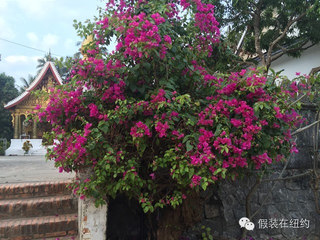 古城里到处都是佛教寺庙,大大小小有十几座,极具老挝特色。常常在路上走着走着,就看到路边绿树红花掩映中露出寺庙的金顶,然后你就可以信步走进去。