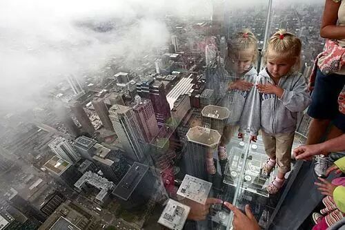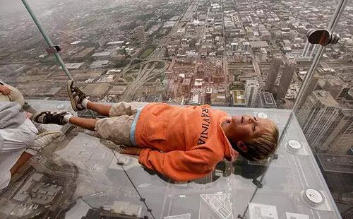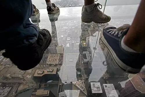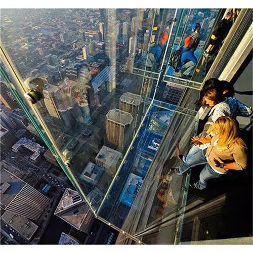 芝加哥西尔斯大厦在103层处设置了4个玻璃为底的盒子结构,呵呵呵,悬空哒~ 从瞭望台向外延伸约1.2米。
