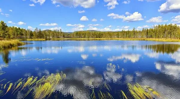 夏季,翠色的桦木林与草甸相接,湛蓝的湖面上倒映着迷人的风光,清新动人。