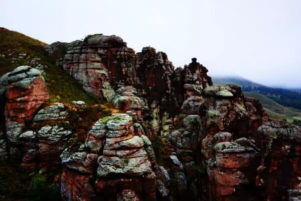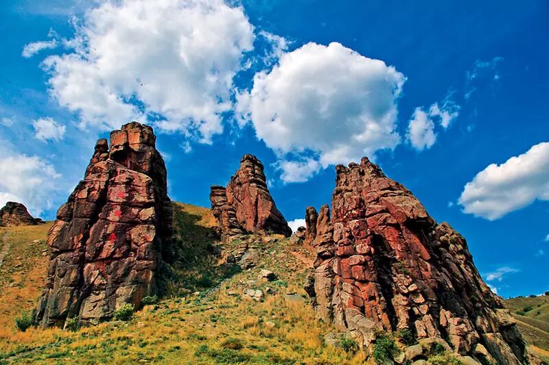 玫瑰色的石峰,形态各异,巍峨壮观。有的像被甲的战将,有的像嘶鸣的战马。它们似当年成吉思汗横扫天下的漠北铁骑,一山一石间,默默诉说着当年的故事。