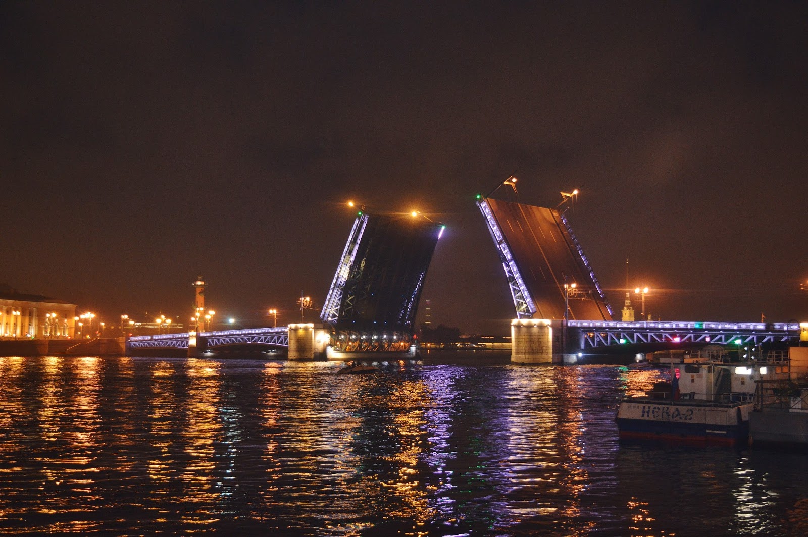 看完芭蕾舞我休息了几小时,后半夜起来到涅瓦河边看了看有名的开桥。圣彼得堡的桥涵很有名,我这次无暇细看,就只看开桥。涅瓦河上的桥梁后半夜开启供大船通行,开桥时许多游客都会慕名观看;尤其是夏天极昼时节太阳入夜不落,涅瓦河白夜开桥成为圣彼得堡经典景观。