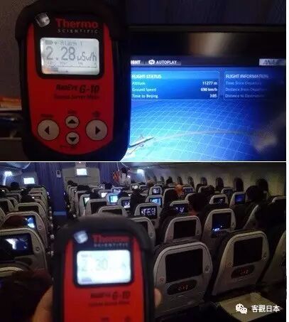 也许您会问,辐射水平升高到多少会有危害呢?这是一个特别复杂的问题,真没法几句话说清楚。我给您看看回国航班上的测得的辐射数据吧——在飞行高度大约1.1万米的高空,机舱内的辐射大约2.3,大约相当于地面数值的20倍。英俊美丽的机长空乘、勤奋多金的商务精英、位高权重的元首领袖,因为他们常常乘坐飞机,所以会比我们一般人接受更多的放射性辐射。他们被辐射伤害了吗?