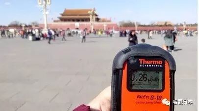 再给您看看天安门广场中心附近的辐射情况,照片上的仪表示数是0.26,差不多是各处测量时所得到的最高辐射示数。但每天在天安门广场执勤的军警保安、旅游拍照的各国游人,他们被辐射伤害了吗?