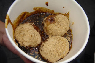 三大炮,当有人点餐的时候,师傅就会从铁锅中扯出一把糯糍粑,分截三坨,有节奏地打到隔壁的铜板上,发成三声清脆响亮的“砰砰砰”,神奇的是三坨糍粑会像乒乓球一样弹入旁边的竹簸中,自动滚上一层黄豆粉,发成三声清脆响亮的“砰砰砰”,神奇的是三坨糍粑会像乒乓球一样弹入旁边的竹簸中,自动滚上一层黄豆粉。