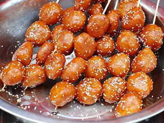 成都的老传统小吃-糖油果子,在当地又叫“天鹅蛋”,就是油炸过的空心汤圆,表面撒上白芝麻,再用竹签穿起来,每颗油炸果子焦黄油亮,吃起来外脆内糯,香甜可口。