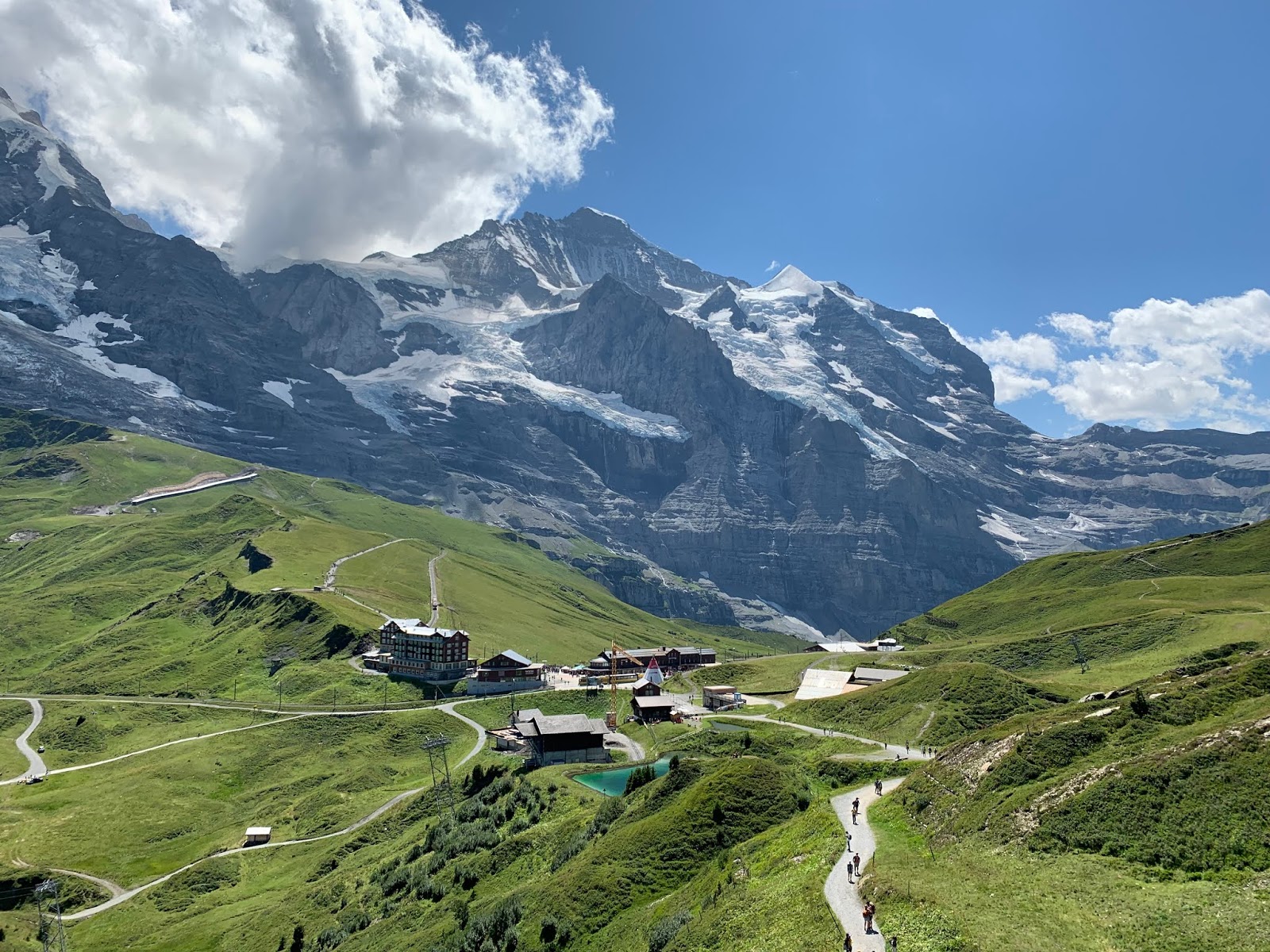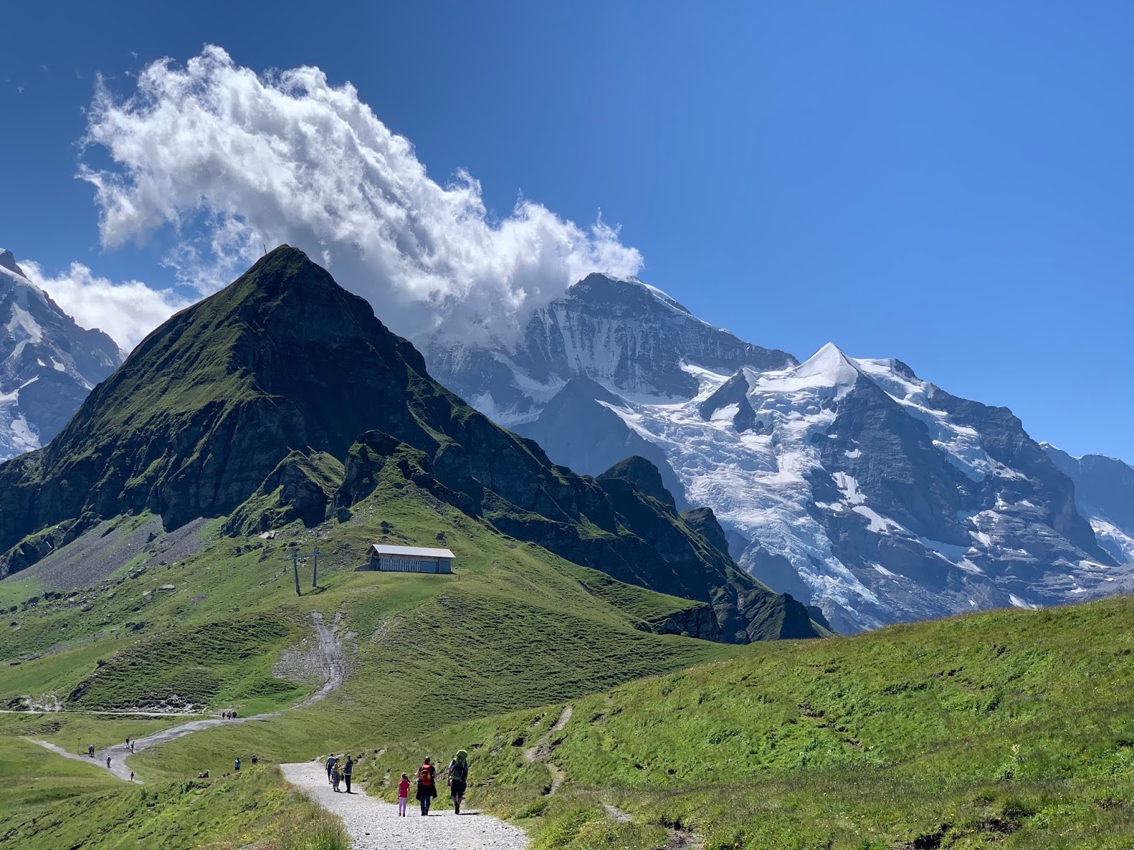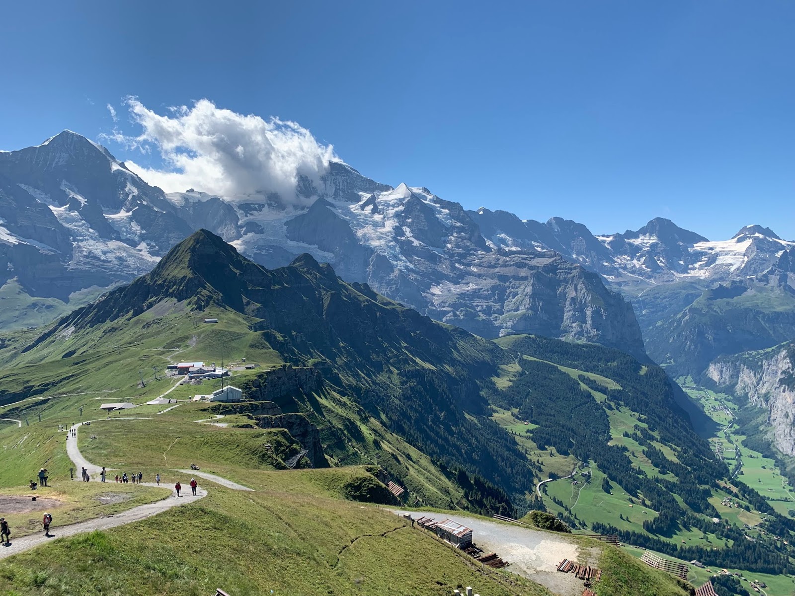 登顶回望,小路上攀登的人络绎不绝,远处的少女峰犹抱琵琶半遮面。