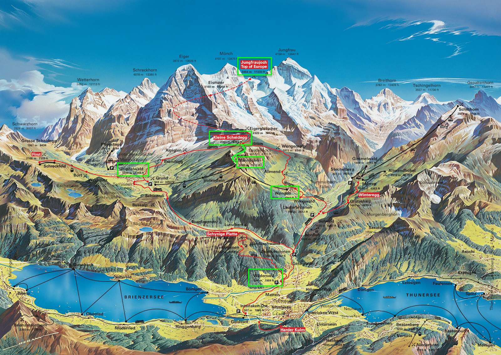 吸取上次在卢塞恩火车站排长队的教训,决定避开较大的因特拉肯的火车站,到下一站,离我们住处不远的Wilderswil去买票。果然很空,而且停车费一天才五个瑞士法郎,看来运气不错。一问,才发现早晨上少女峰的列车已经全部爆满,最早的上山列车是下午1点的,这一下子把我整个的日程安排全打乱了。原来的构想是早晨从Wilderswil坐车经格林德瓦Grindelwald到Kleine Scheidegg,然后换登山列车上少女峰Jungfraujoch(下图左边的线路),下午从少女峰回到Kleine Scheidegg,徒步到Mannlichen,坐缆车下到文根Wengen,再从文根回Wilderswil(下图右边的线路)。下图最中间的两个方框之间就是有名的徒步线路 Panoramaweg Trail ,从Mannlichen到Kleine Scheidegg,整条线路是沿着山脊在走,坡度很平缓,风景据说绝佳。