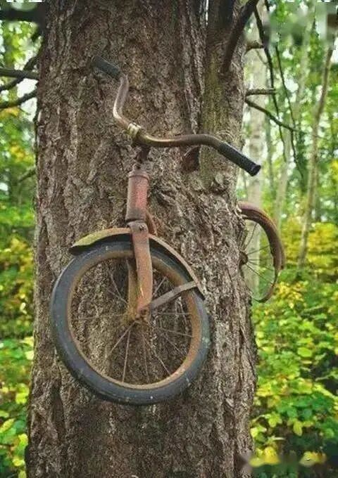 这个车轮放在这里多少年了,大树已经要将其吞没。