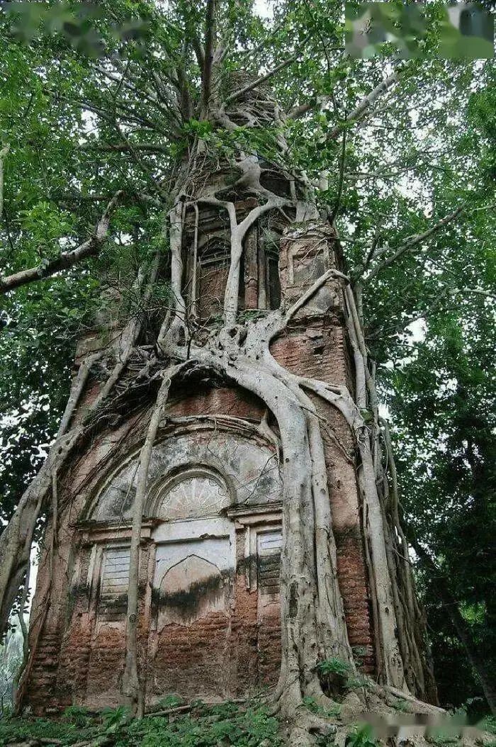 孟加拉国的神圣菩提树,坚定地拥抱着古老的湿婆神庙。