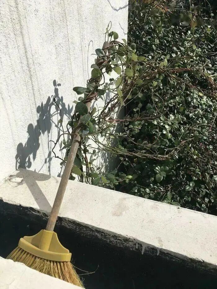 这家伙太懒了,这是多少年没有打扫过了,藤条爬满了扫把。