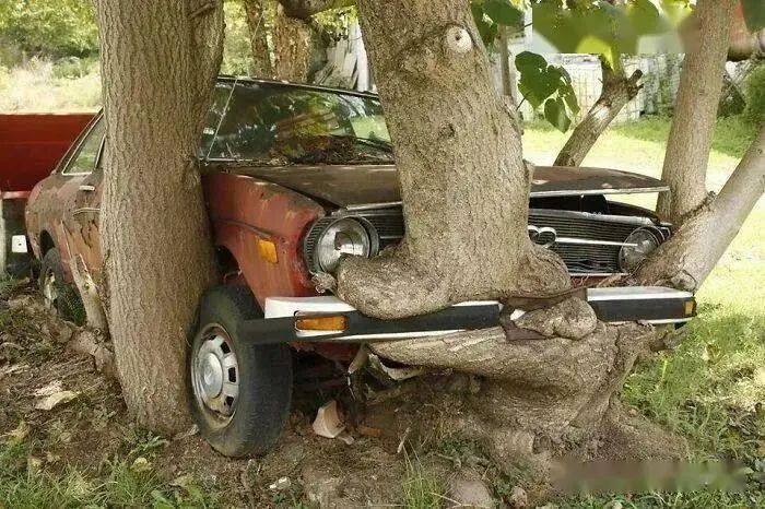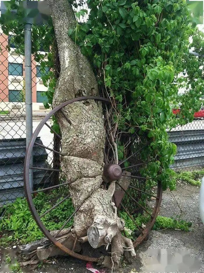 这个车轮放在这里多少年了,大树已经要将其吞没。