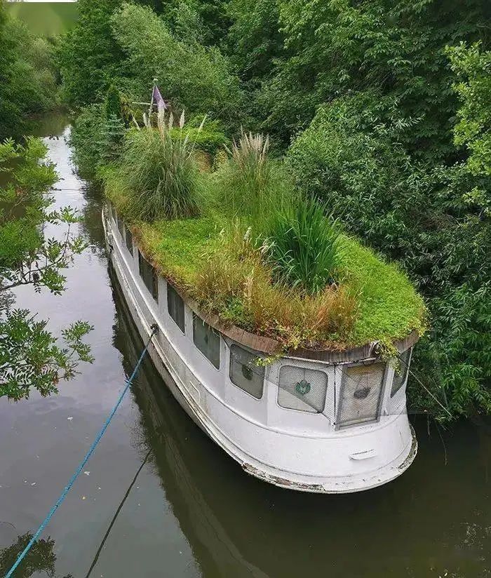 不知道这条船停在这里多少年了。上面长满了杂草。