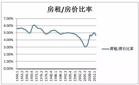 那麽到底是通过房租上升还是房价下跌来让房租对房价的比率回到历史平均呢?2007年,美国三位经济学家(Davisa, Lehnertb,和Martinb)发表了一篇研究美国整体房租对房价比率的文章。文章的摘要,现在读起来让人凛然心惊,这样写道:“根据美国1960年以来数据我们构建了房租对房价比率的时间序列。我们发现在1960到1995年之间美国的房租对房价比率在5%到5.5%之间,但是1995年後很快下降。到2006年末,房租对房价比率已经到了3.5%的历史低位。如果房租对房价比率要在今後五年回到历史平均,房价可能会下降很多。”