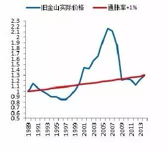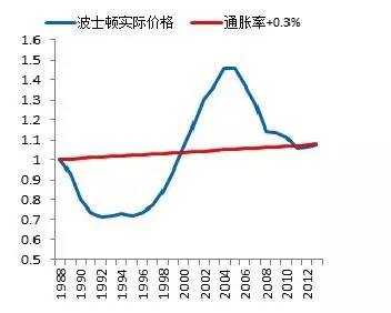 这个规律是如此的精准,以至于在这100年中只有1943-1947是唯一的明显跑赢通胀又没有跌回去的阶段。这个规律不仅适用于美国平均,而且适用于一线城市。到2013年,美国的平均房价已经超过扣除通胀後的历史平均,并不是便宜货,意味着将来房价的年平均涨幅应该会低于3%。这个回报率是否足够高,是否能达到分散投资的目的,见仁见智。但是中国投资者应该知道这个规律。