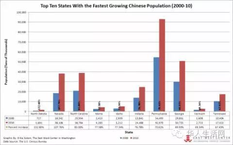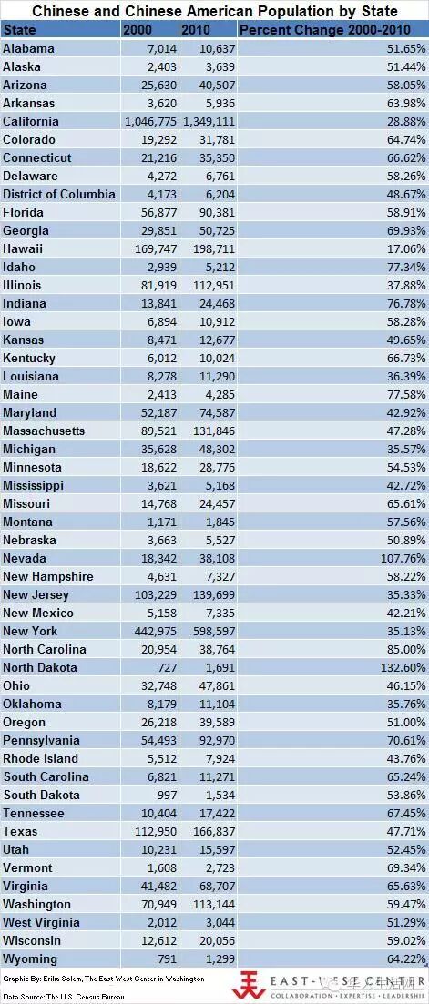 15)2000至2010年,全美34个州华人人口增长超过50%,其中北达科他州最为突出,从2000年的727人增长到1,691人,增幅高达132.60%: